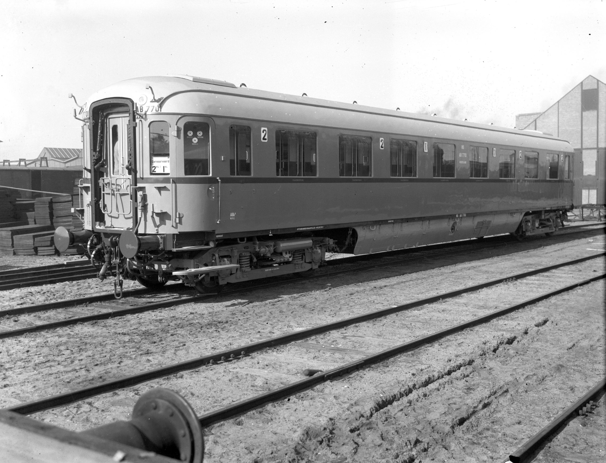 | huidige versie | 13 dec 2021 21:22 | 3.934 × 3.006 (2,48 MB) | Taigagaai (overleg | bijdragen) | Het nieuwe door Werkspoor gebouwde turkooise plan D rijtuig NS Abd8u 7701 staat gereed voor de presentatierit voor de pers op 14 september 1950. |